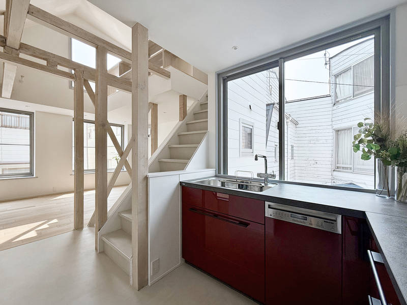一般的な核家族向けの3LDKから、現代の住まい方に合わせて、よりおおらかな気積をもつ住空間へと更新した。街、住宅街、テラスハウスの建築群、住戸内部へと、スケールが段階的に縮小していく特徴に着目し、街から緩やかに連続する空間性を建物内部へと引き込むこととした。階段や廊下の仕上げを外部から内部へと連続させ、街と住まいの関係を緩やかにつなげている。