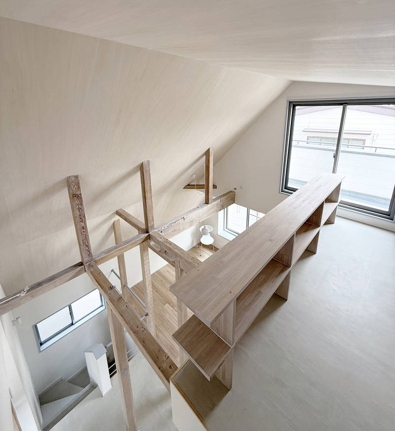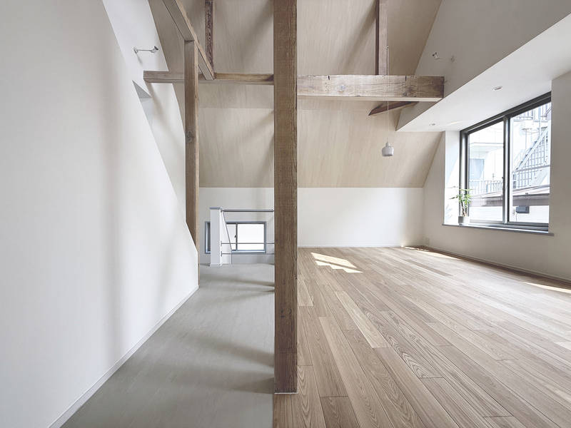 空間操作としては、2階はロフト床の一部を解体し、間仕切りを取り払うことで、一つのLDKとして、大きな気積と、光の広がる空間を獲得した。1階では、クローゼットによって分割されていた主寝室と客間を一室化し、大きな引戸で仕切る可変的な空間とした。窓はペアガラスへ更新し、断熱性能を大きく向上させ、現代の仕様に合わせた快適な住環境を整えた。​