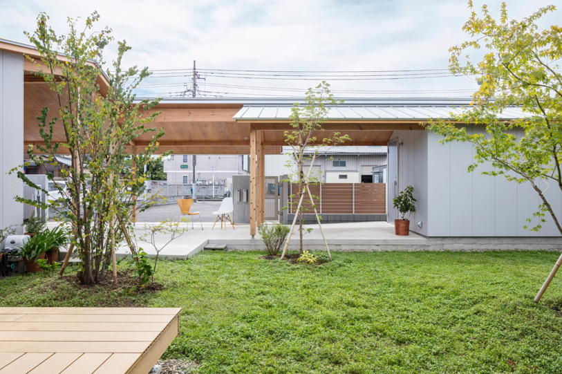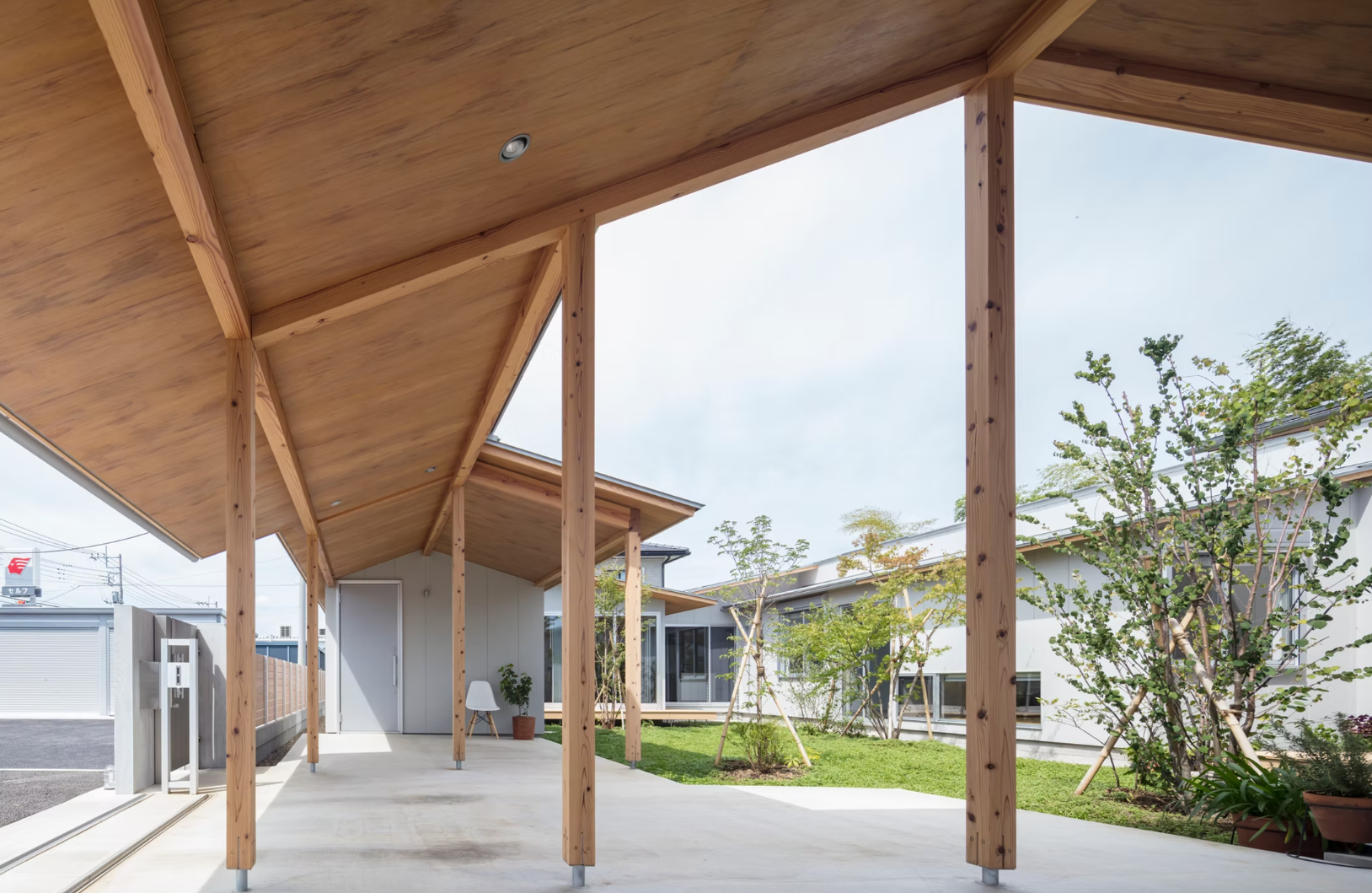 全体構成は共用エントランスとしてのピロティから、中庭を中心に各部屋を数珠つなぎに配置している。諸室が雁行しながら中庭を囲うことで、中庭には大きな庭と小さな庭のような特性が生まれ、住戸同士は直接見合わず、部屋に応答した小さな庭を望むことで、なんとなく互いの気配を感じ、「間接的に見守り合う住まい方」が生まれることを目指した。 「開かれた中庭」によって少し公共的な装いを持つ住宅が、変わりゆく社会や将来的な家族構成・用途の変化を受け入れ、街の風景とともに未来へと住み継いでもらえる家となることを期待している。