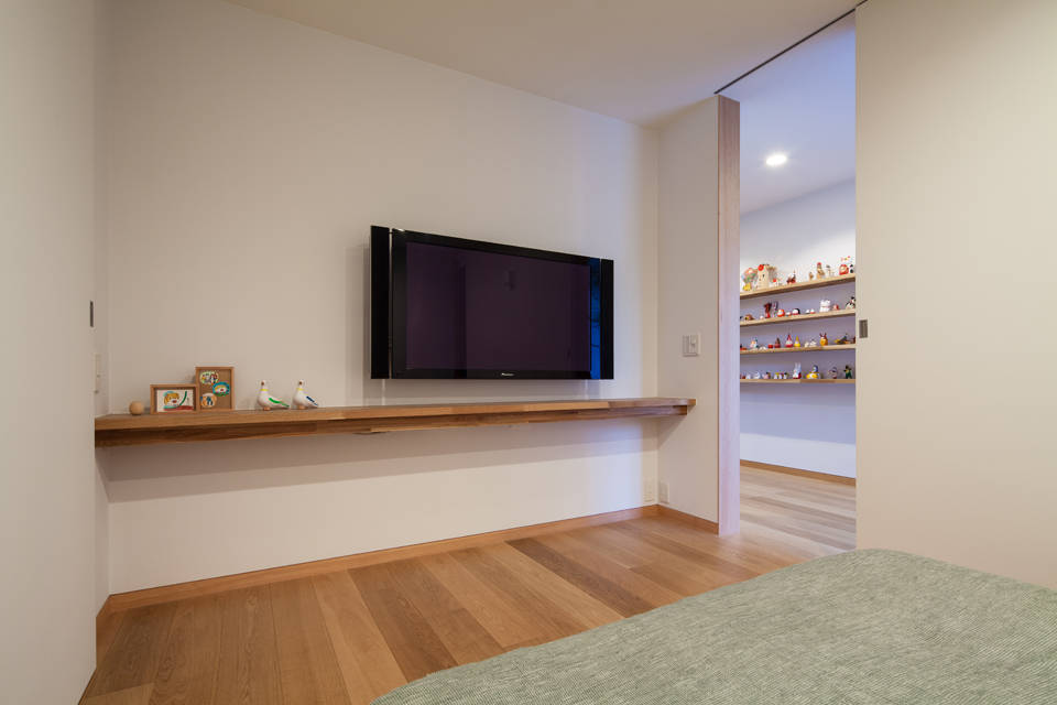 隠すための収納と、趣味のものを飾るための棚の量・場所なども設計段階から熟考し、物を飾りながらもスッキリと暮らせるようにしました。
