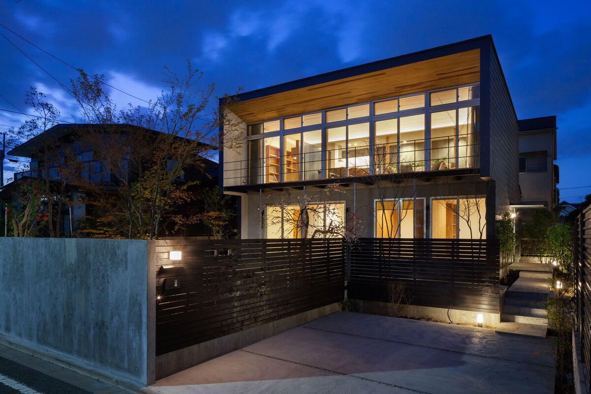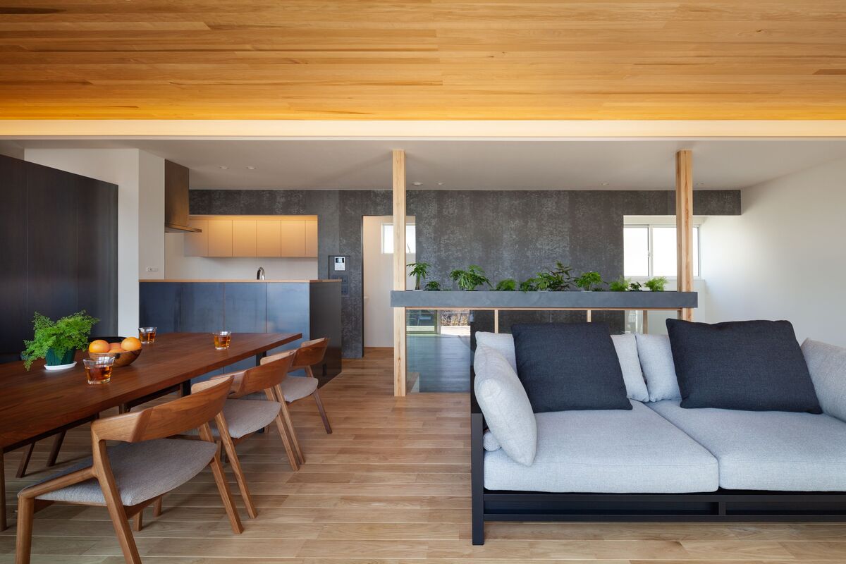 幅9mの大きな窓でデッキテラスに開いたLDKとワークスペースのある家、素材感のあるサステナブルな材を使った簡素で普遍的な住まい