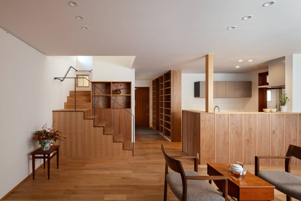 ご両親から引き継いだ庭(樹齢60年以上の梅等)と中庭デッキを地域に開く。生まれ育った家で使われていた建具も利用し、暮らしも引き継ぎながら、人が気軽に集える暖かな家。
