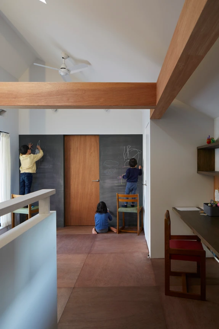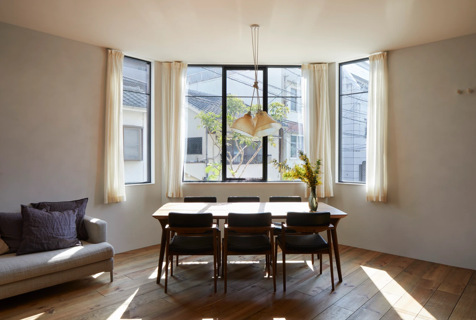 愛媛県の街中の住宅です。周囲を高層ビルに囲まれているため、窓先空間を確保して光や風を取り込める変形八角形の平面で構成しています。