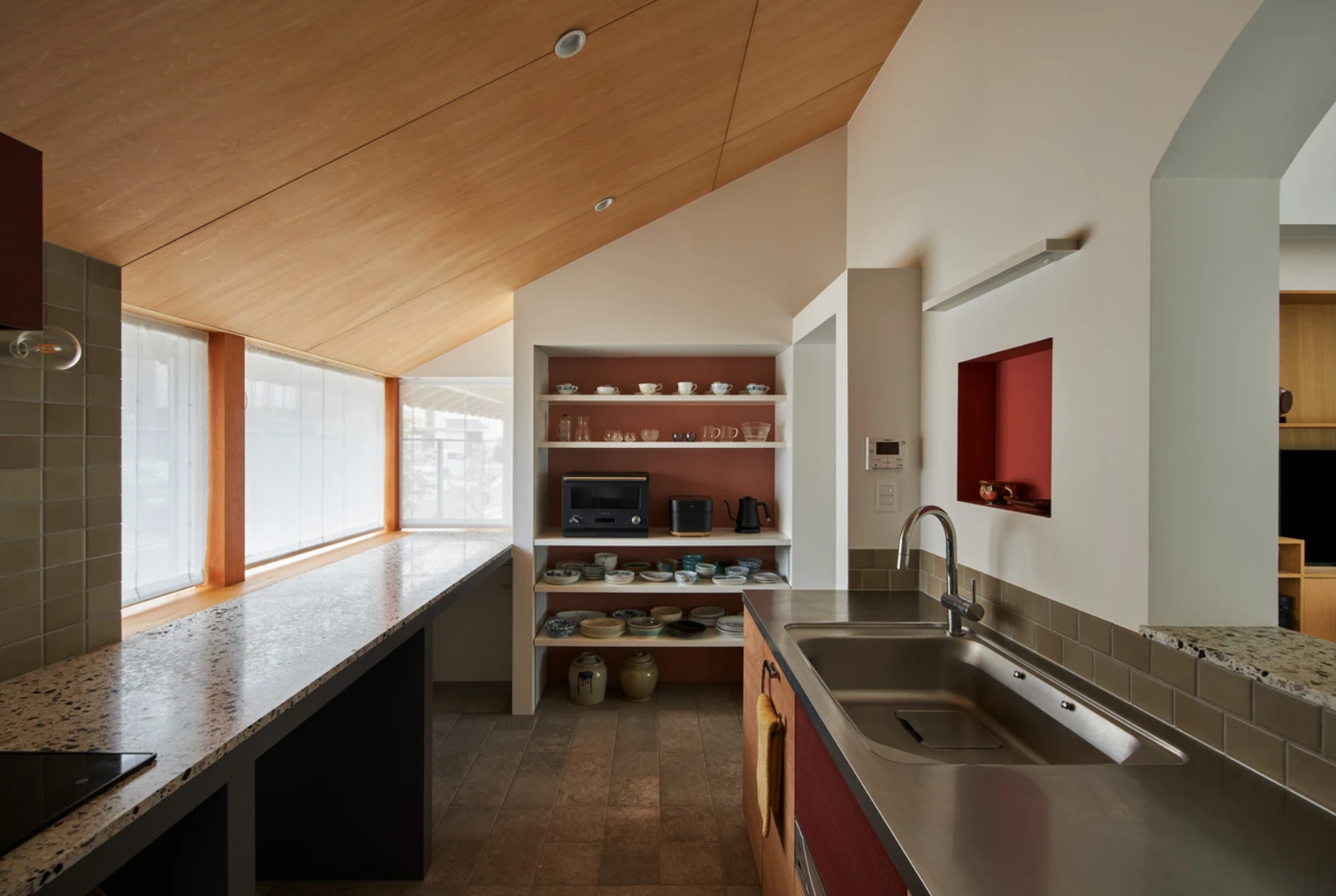 リビングと2階の和室をつなぐ細長い吹き抜け空間には、屋根を支えるかのように天井に向かって長く伸びる壁一面の棚を設えました。
