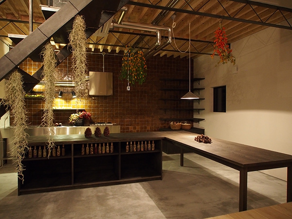 住宅のキッチンというよりも、お店のキッチンを延長させたようなイメージで提案。キッチン背面に敷き詰めたハンドメイドスタイルのタイルは、コンクリートや鉄筋が持つ無機質な印象を和らげ、温かみのある雰囲気を演出しています。本物の素材を厳選し、限られた素材を丁寧に使うことで、住まい全体に上品さを与えています。