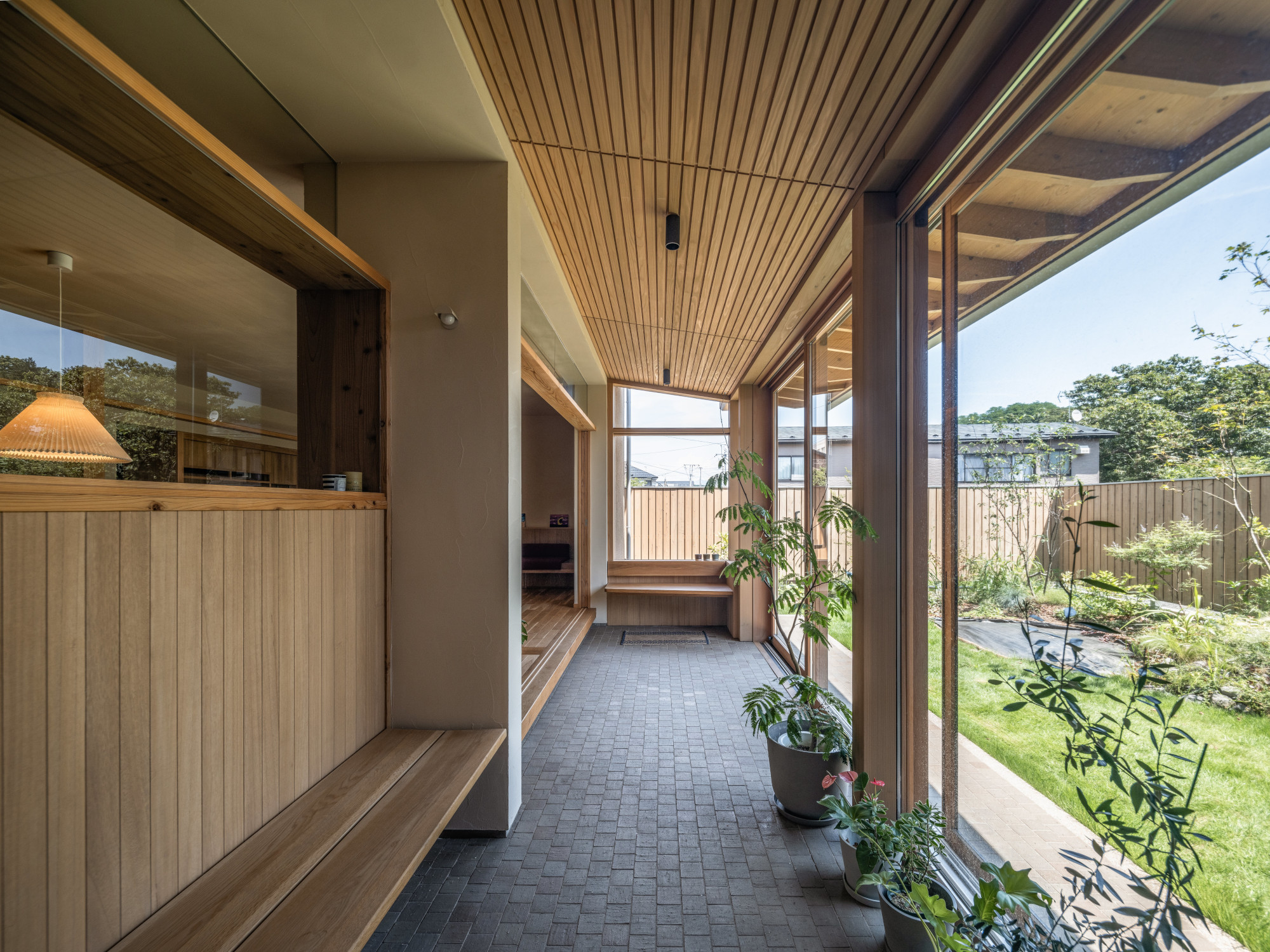 土間は、外物置や靴箱、手洗いなどを兼ね備え、家に入る動線をスムーズに繋げます。庭側の土間はガラス張りで、夏は縁側、冬はサンルームとして居住空間と庭を繋げ、季節を感じながら過ごせます。居住スペースは南側に大きな窓を開け、冬は暖かく、夏は涼しい設計です。奥様の在宅ワークスペースは庭を挟んでリビングと直角に配置。家族の様子をいつでも感じながら集中できる空間に。