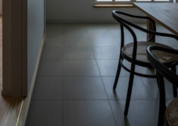 また、食堂の床は一段掘り下げてタイル張りにすることで、多目的に使えるようなデザインとしました。二世帯住宅ということもあり、親族が集まる場として、パブリックな使い方もできるように設計しています。床暖房も備えているため、冬場も快適に過ごせます。
