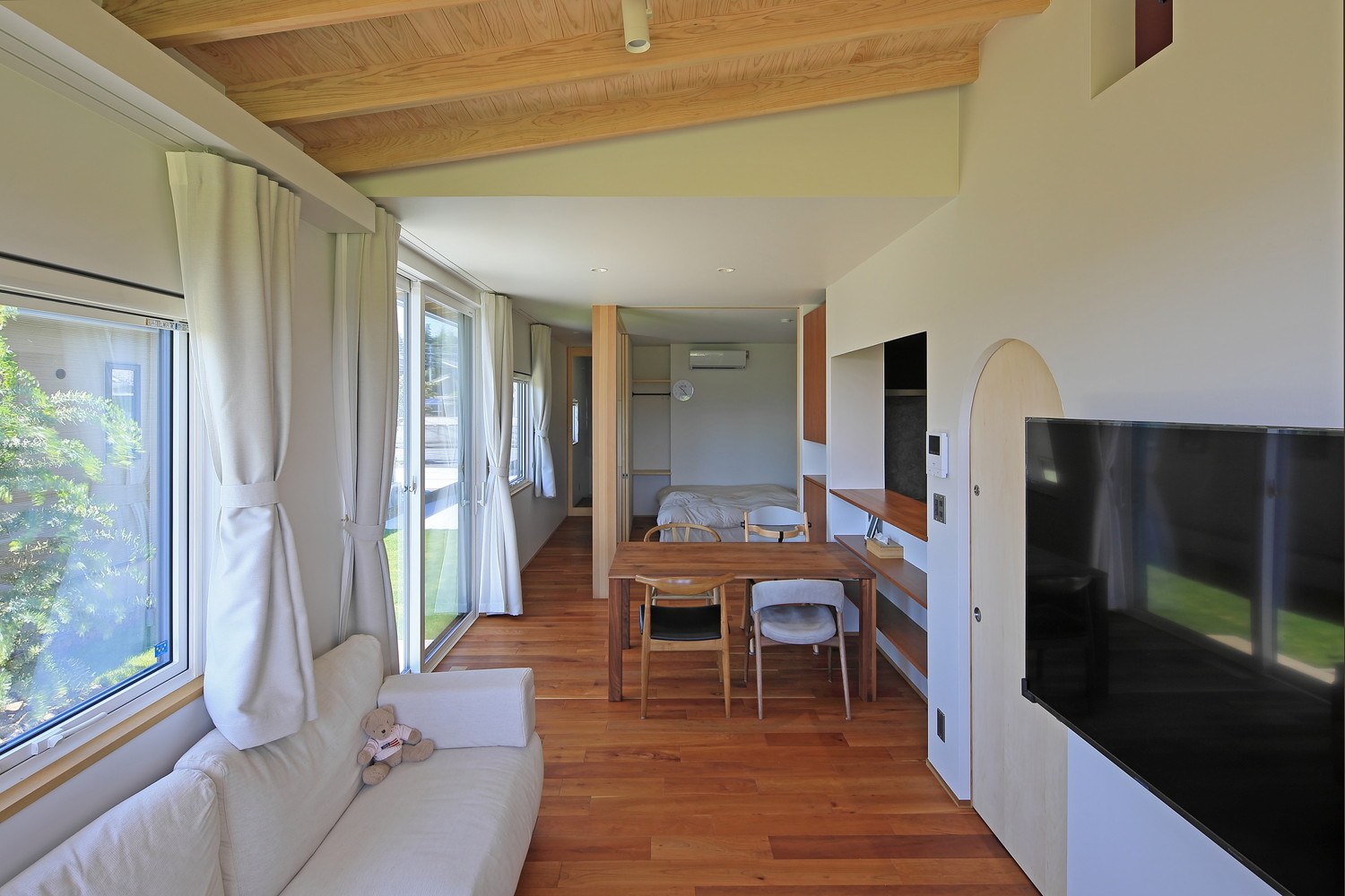 家族の将来を見据えた、シンプルで無理のないプラン。その中心には、リビングから望む穏やかな田園風景があります。