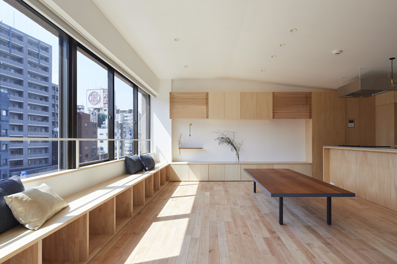 ちゃぶ台を囲むように、低い収納やまちを眺めることができる窓辺のベンチを配置し、床に座った時にもすぐ手の届く所に収納があり、かつそれらが背もたれにもなるようにしました。