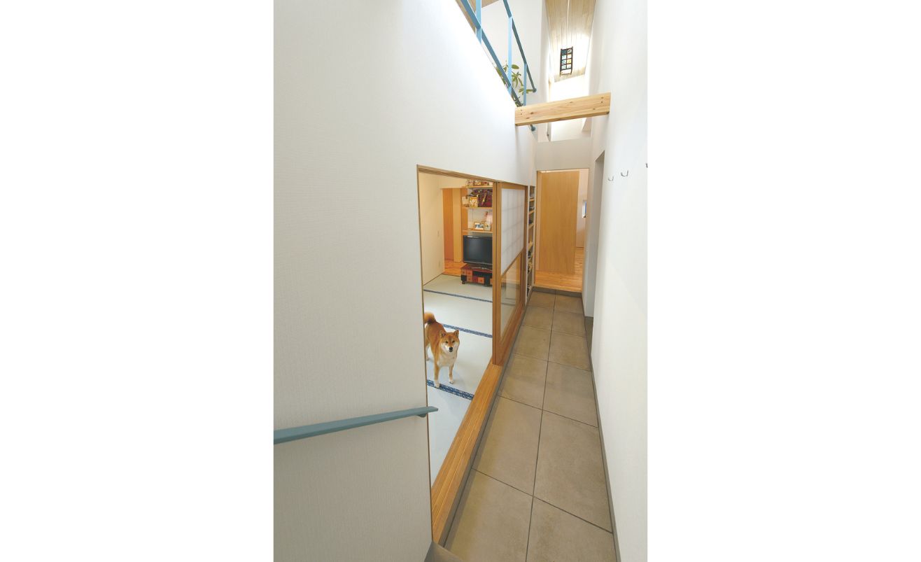 屋根は無落雪とし、冬の除雪負担を軽減しています。裏庭にはドッグランや家庭菜園として使えるスペースを確保しており、愛犬も心地よく過ごせる環境に。通風・採光に配慮した開口部計画で、屋内に自然の光と風を取り入れ、街との緩やかなつながりを持たせています。青森県産材や津軽塗など、地域の素材や技術も丁寧に取り入れています。