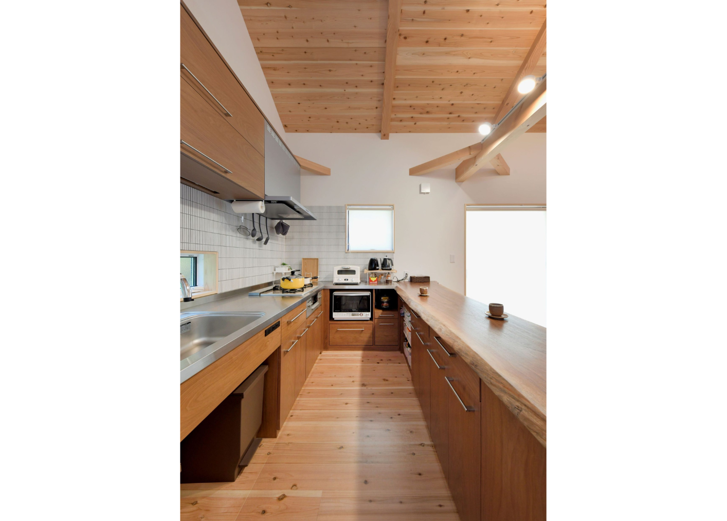 子どもが自分の部屋で過ごす時間は限られているということを踏まえ、将来必要になるスペースは用意はしながらも、個室のような間取りではなく、家具や収納などを使って仕切る柔軟な設計としました。住まい全体はオープンで、可変性の高い構成です。あわせて1階も小さく区切らず、LDKをひとつながりの大きな空間にすることで、家族の動きや気配が自然と伝わる伸びやかな暮らしを可能にしました。