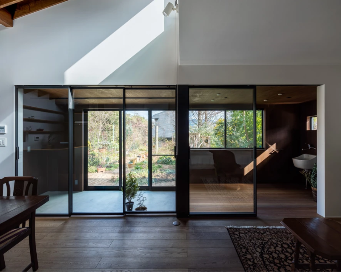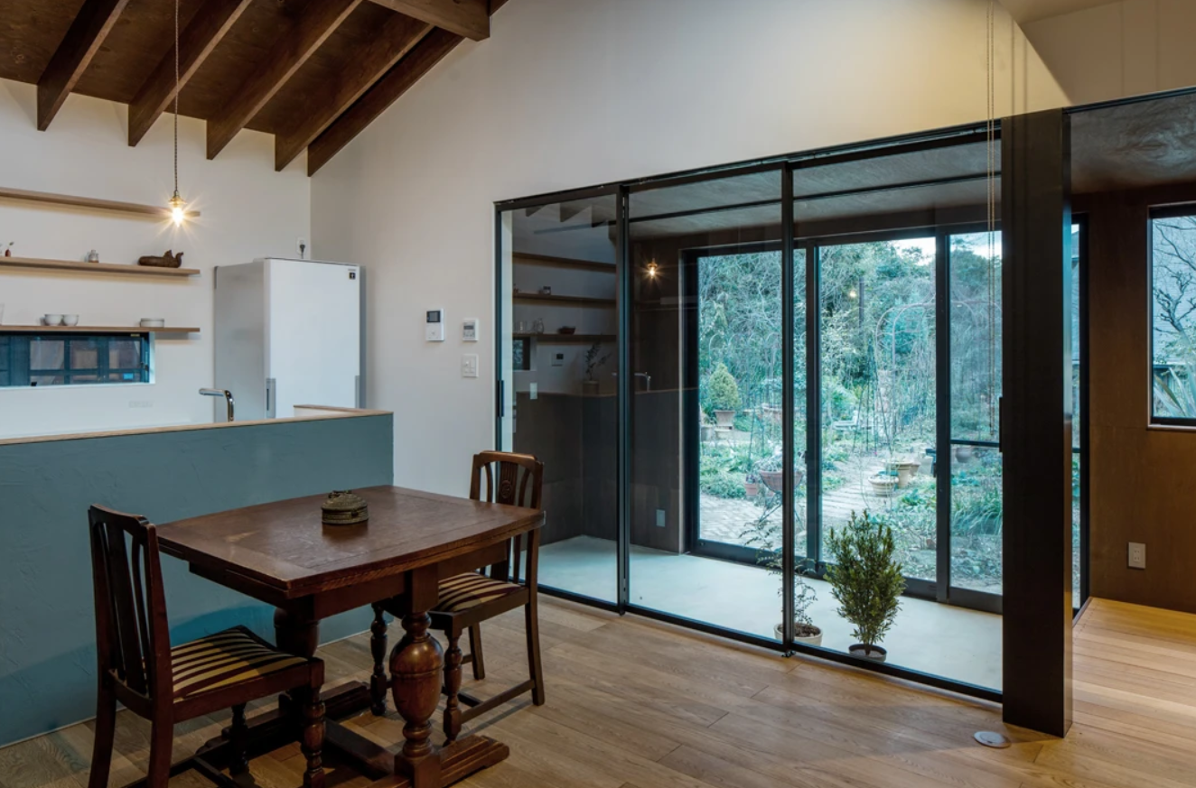 リビングと土間、土間と庭をつなぐ扉を全面ガラスの引き戸にすることで、リビングにいながらも庭全体を眺め、楽しむことができます。