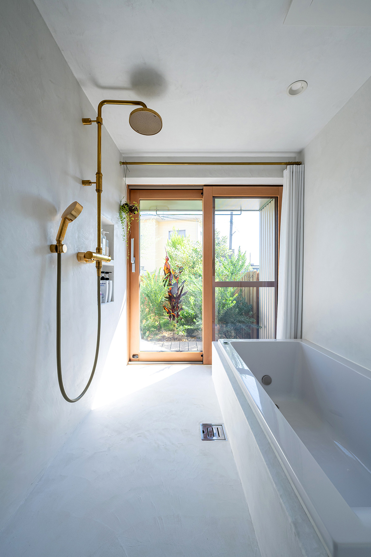 水回りからバス、シャワーまでを一直線にまとめた動線設計で、機能的でありながらも、心地よさを損なわないレイアウトに。