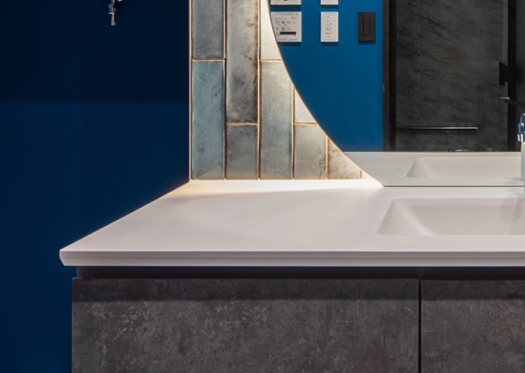 「お気に入りのアイテムを中心に空間を整える」。そんな住まい手の想いを、細やかな素材選びと光の演出で丁寧にかたちにした洗面空間です。