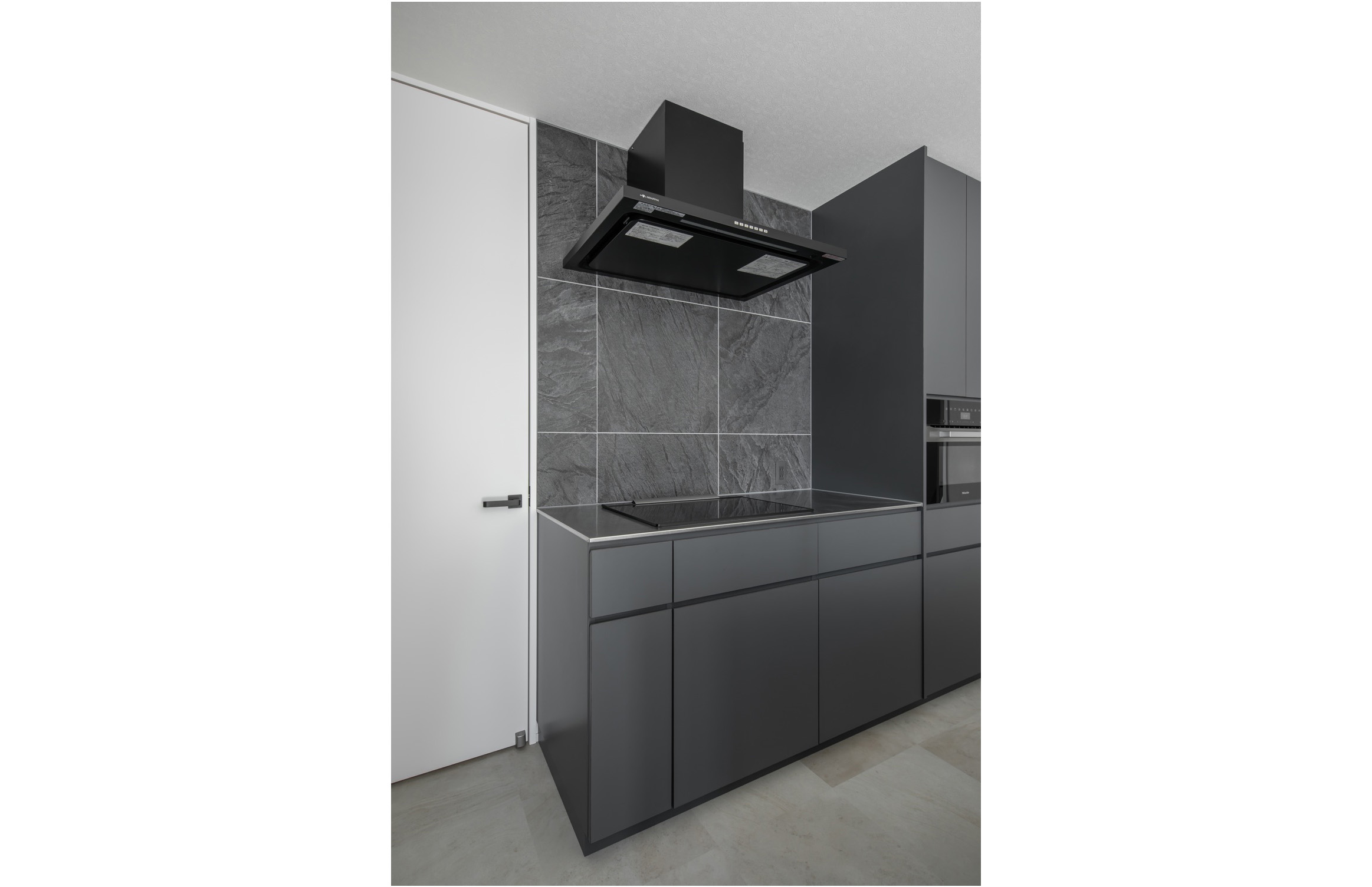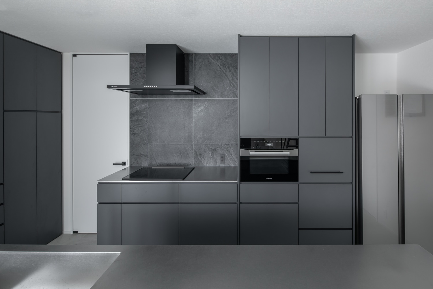 ブラックグレーのメラミン材で仕上げた収納豊富な2型キッチンです。天板はステンレスバイブレーション仕上げ。設備はブラックで統一し換気扇はアリアフィーナ、IHはグリルレスのユーロスタイル、ビルトインオーブンと食洗はドイツのミーレ、水洗はSANEIです。ホテルライクなインテリアの主役になるキッチンです。