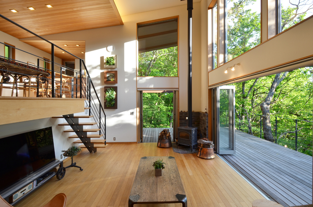 段差によって空間を緩やかに分けながらも、ひと続きの広がりを感じさせるスキップフロアの設計。床の高さを少しずつ変えることで、視線や光にリズムが生まれ、開放感と奥行きのある空間が広がります。リビングから続く半屋外のデッキでは、空と緑を眺めながら四季の移ろいを楽しむことができ、吹抜けと高低差が空間に一体感をもたらします。スキップフロアは狭小地に限らず、広い敷地で間延びしてしまう空間にも効果的です。
