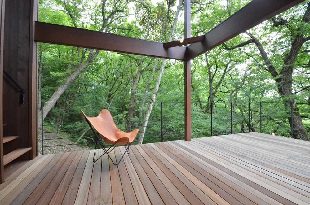 玄関扉には、「黒錆のコールテン鋼」を貼り、床には南佐久で採れる赤や黄の独特な錆色の「佐久鉄平石」を張り、どちらも経年美で味わいの増す素材を採用しています。柱には、檜の丸太を山に放置して天然の黒カビをまとわせた「錆丸太」を採用。これは茶室などの数寄屋建築で用いられる素材で、和の趣と天然の力強さを感じます。