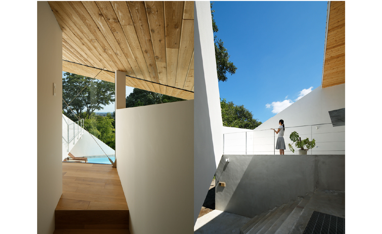 段差に導かれて視線がゆるやかに移ろい風景が少しずつ切り替わっていく。その流れが日常に旅のようなシークエンスをもたらします。
