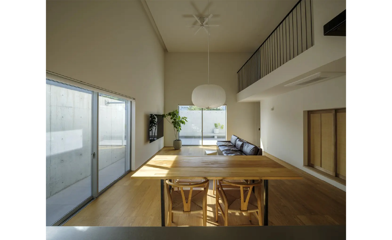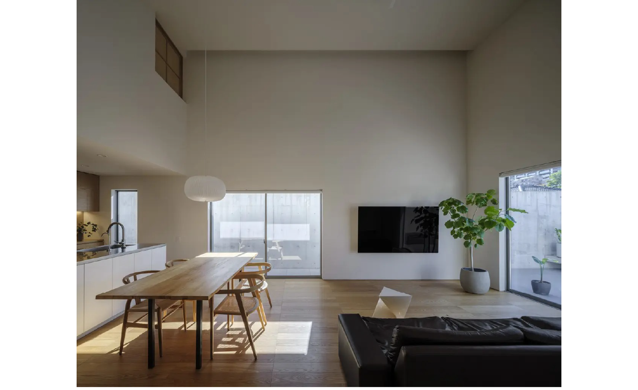 2・3階は住居空間。1階のRC壁を立ち上げてテラスを囲むことで、外からの視線を遮りながら大開口を可能にしました。吹抜や天窓から光が行き渡るLDKは、カーテンを閉めずに過ごせる開放感が魅力です。