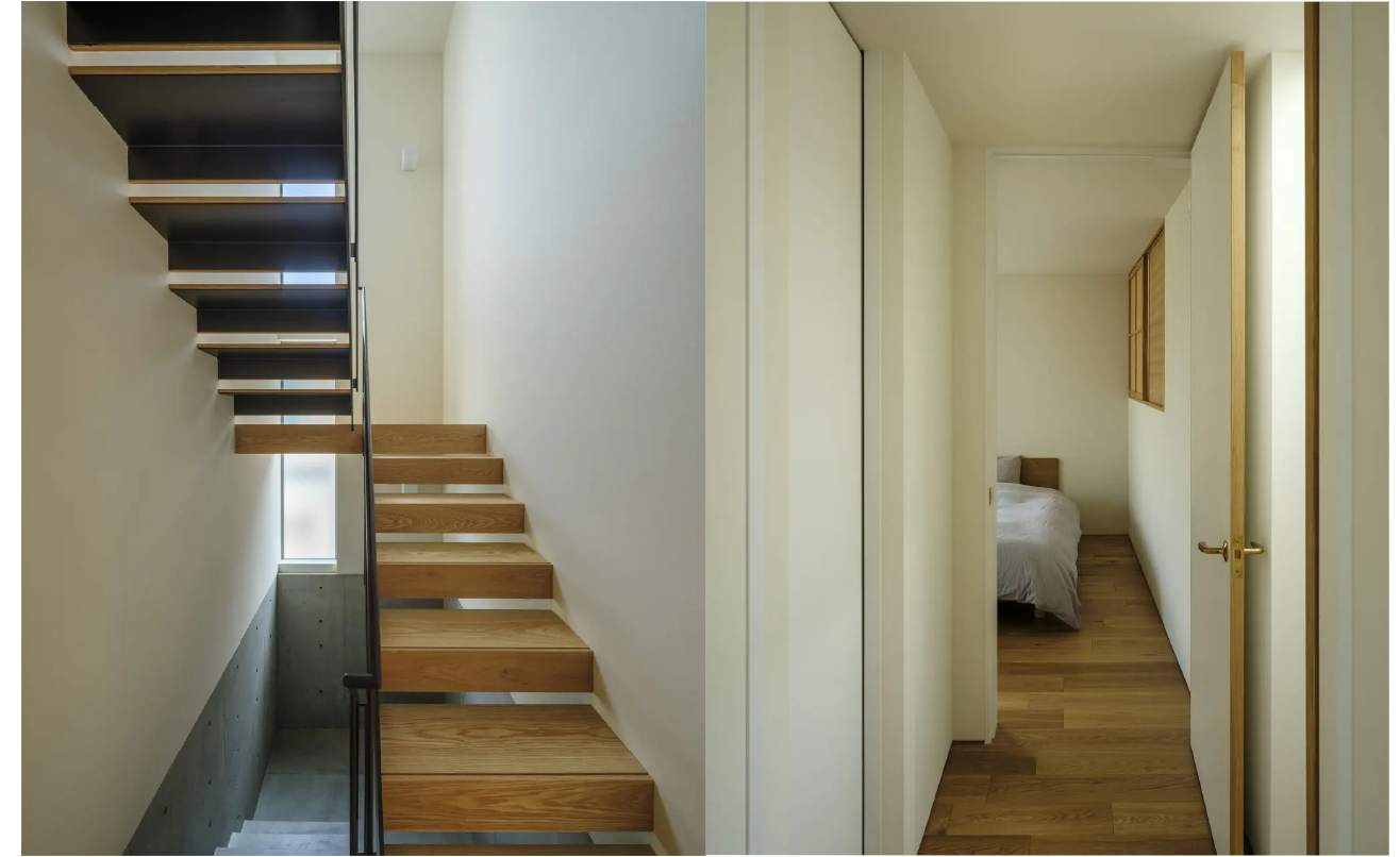 階段はコンクリートから木造へと自然に繋ぎ、スリット窓から光を取り込むことで浮遊感と安全性を両立。