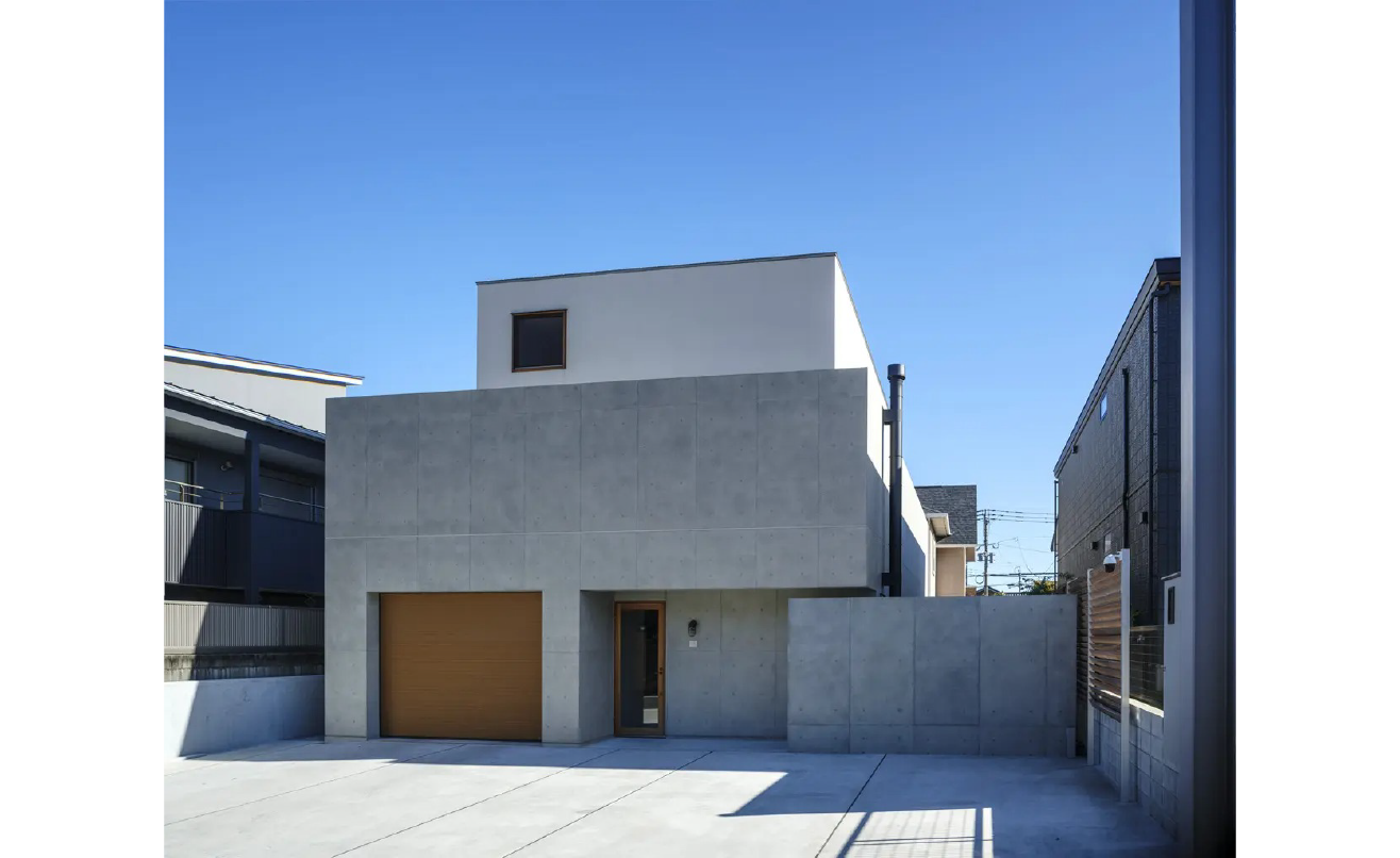 外観はRCと木造のコントラストをそのまま表現。木調シャッターや木製サッシが素材の硬さを和らげ、住宅街の中で静かに際立つ姿を見せています。