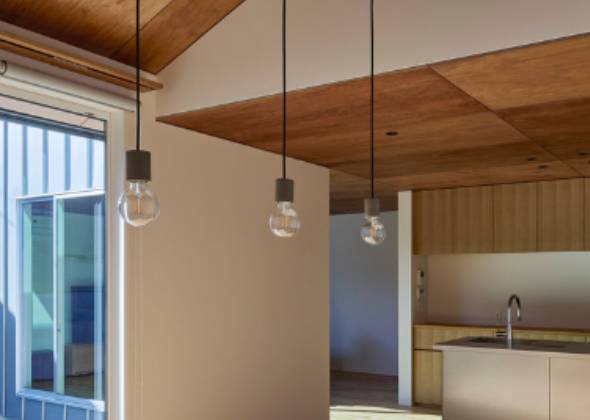 床にはお施主様が希望されたオーク材を採用。天井は梁を表しにし、仕上げにはラワンベニアを用いてオイル塗装で色を調合しました。この塗装作業はDIYでご家族も一緒に参加し、いくつかのパターンを試しながら「自分たちの色」をつくりあげています。手に入れやすい素材にひと手間を加えることで、新しい部分と古いものが心地よく調和する空間となりました。
