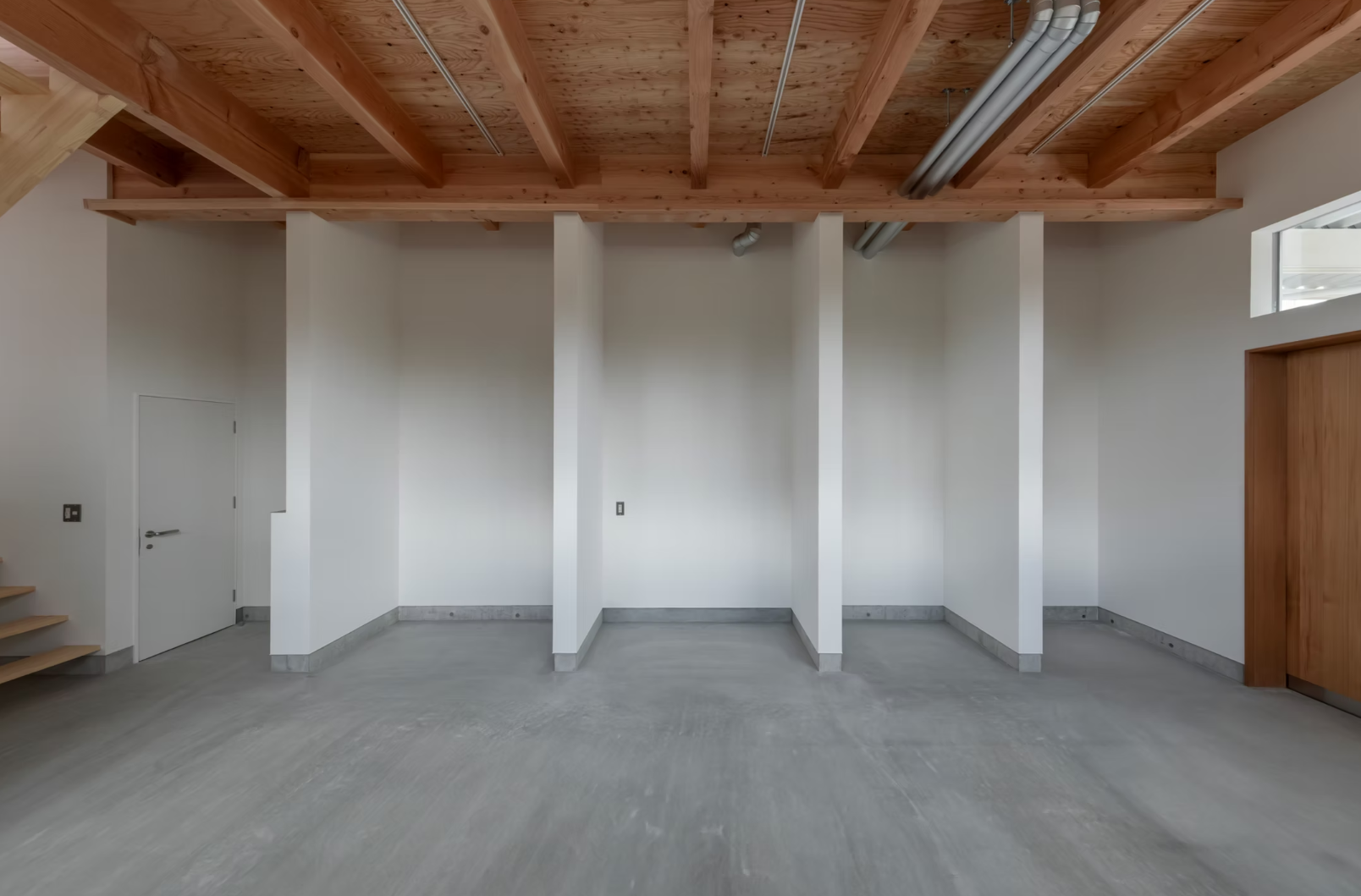 この条件の中で、「仕事の場所」と「生活の場所」、そして大容量の「収納場所」をどう確保するかが、この住まいの大きなテーマとなりました。