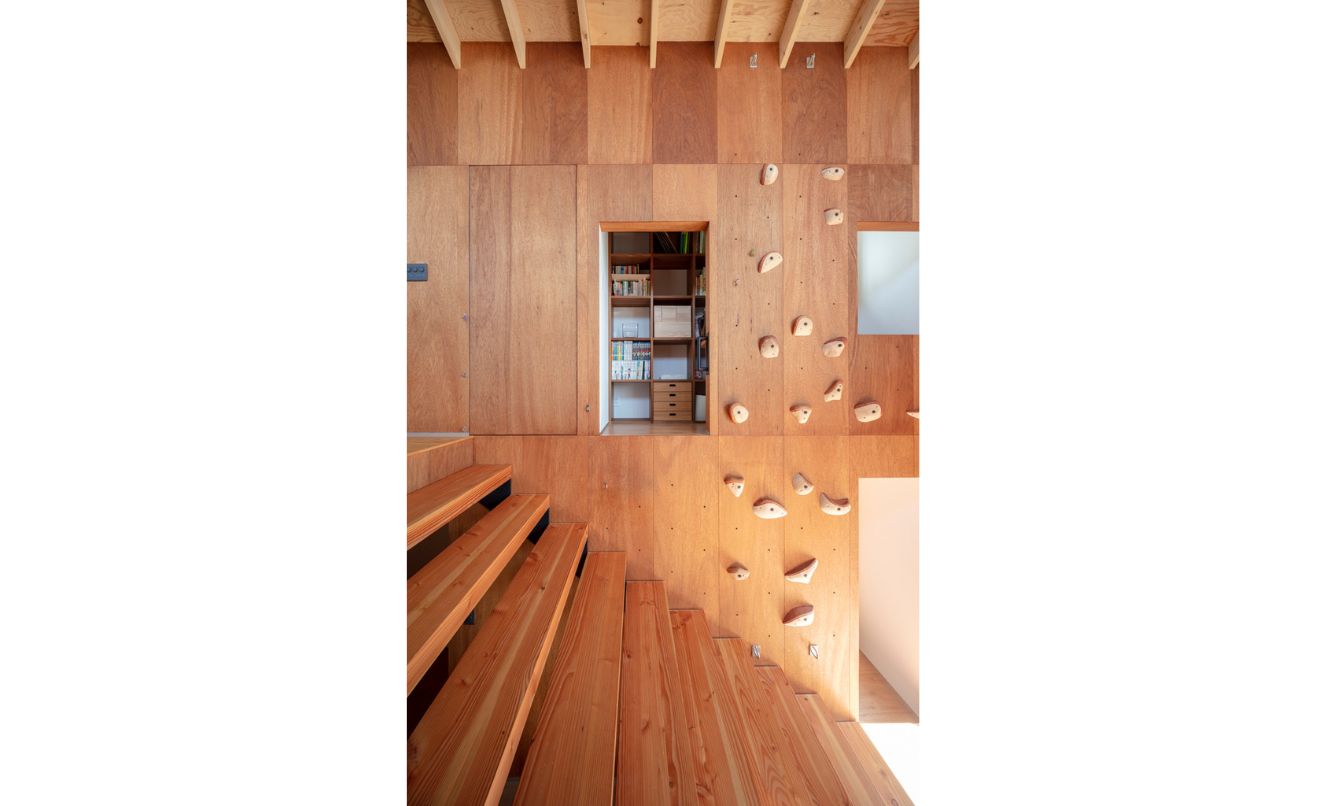「子どもが楽しく過ごせる場所をつくりたい」というご要望に応え、段幅を広くとった階段や壇上のスペース、ボルダリングを設けた壁など、いくつかの居場所を住まいの中に計画しました。