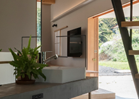 また、くの字に折れた空間の一角には洗面台を配置しました。一般的には脱衣室の中に収めることが多い洗面台ですが、この住まいではあえてLDKと寝室をつなぐ生活動線上に設置しています。中央に置くか端に寄せるかで、家全体の雰囲気や動線は大きく変わります。「暮らしの一部を隠さない」という考えのもと、洗面台は家具の一部としてデザイン。圧迫感を与えない細身のフォルムで、空間を区切る役割も担います。細い脚やフレームを用いることで軽やかさを際立たせ、オープンでありながら適度なメリハリを生み出しています。