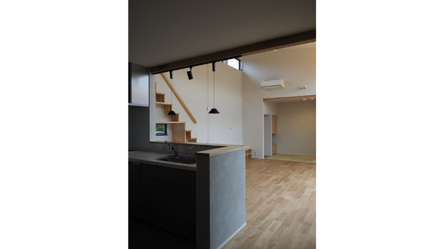 階段下をワークスペースとし、本棚や収納棚を兼ねるデザインにすることで、空間のアクセントに。実用性とデザイン性を兼ね備えた階段です。