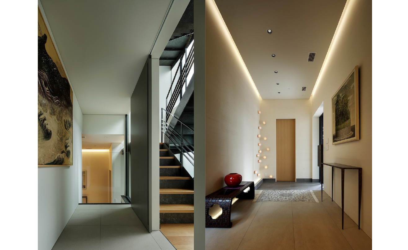 光と素材が呼応しギャラリーの趣をまといながら、来客をもてなし家族の日常も豊かに包み込む──設計の基礎思考が結実したアート空間のような住まいです。
