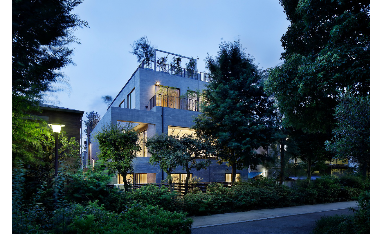 東京都渋谷区の緑道沿いに建つのは、ご夫婦とお子さん、祖母、猫が暮らすRC造の住宅。