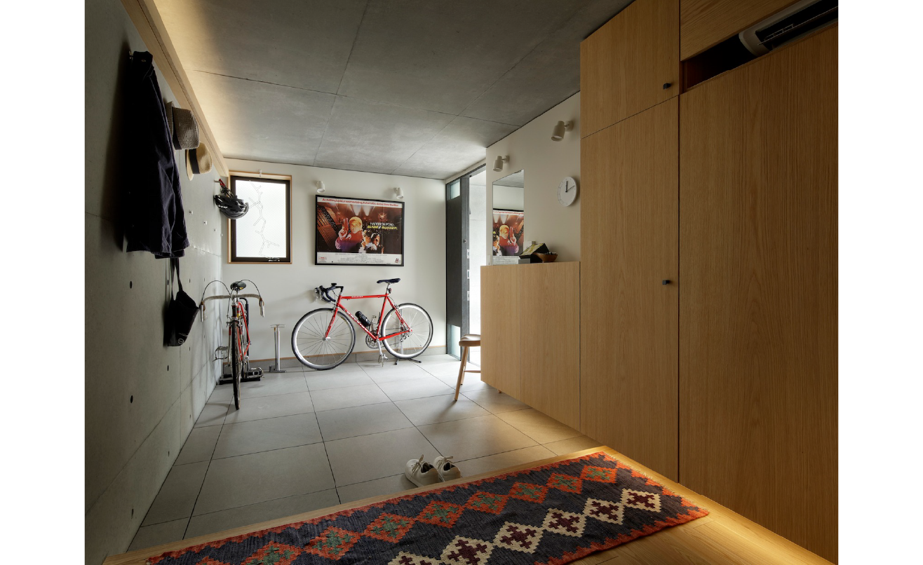 道路面から下がった敷地条件を活かして地下にはご主人の仕事部屋や自転車を置くエントランス、1階には寝室や奥さまの仕事部屋、2階は勾配天井のLDKとテラスを計画。それぞれの階が廊下と階段でゆるやかに繋がっています。
