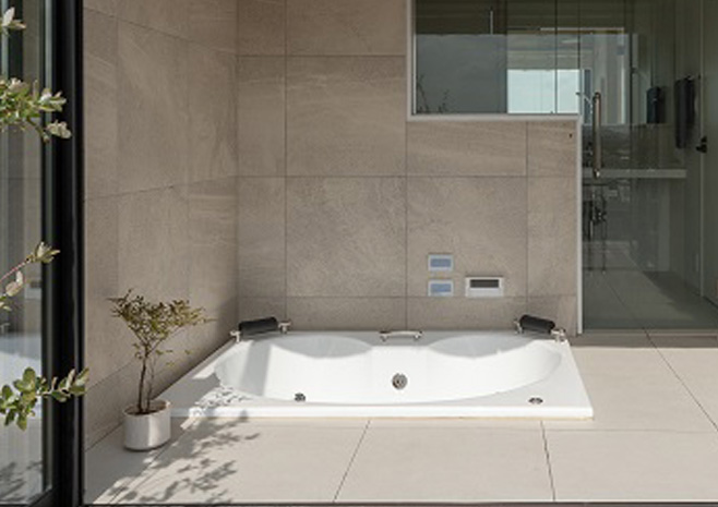 ピクチャーウィンドウや引き違い窓ではなく、すべて開放できるサッシを採用しました。浴槽は床に埋め込むタイプのものを採用。高台という立地上、外からの視線はほとんど気にならず、浴槽からは目の前に空が広がります。景色を独り占めする贅沢なひとときは、旅行先の宿で過ごしているかのような非日常を日常に取り込んでいます。