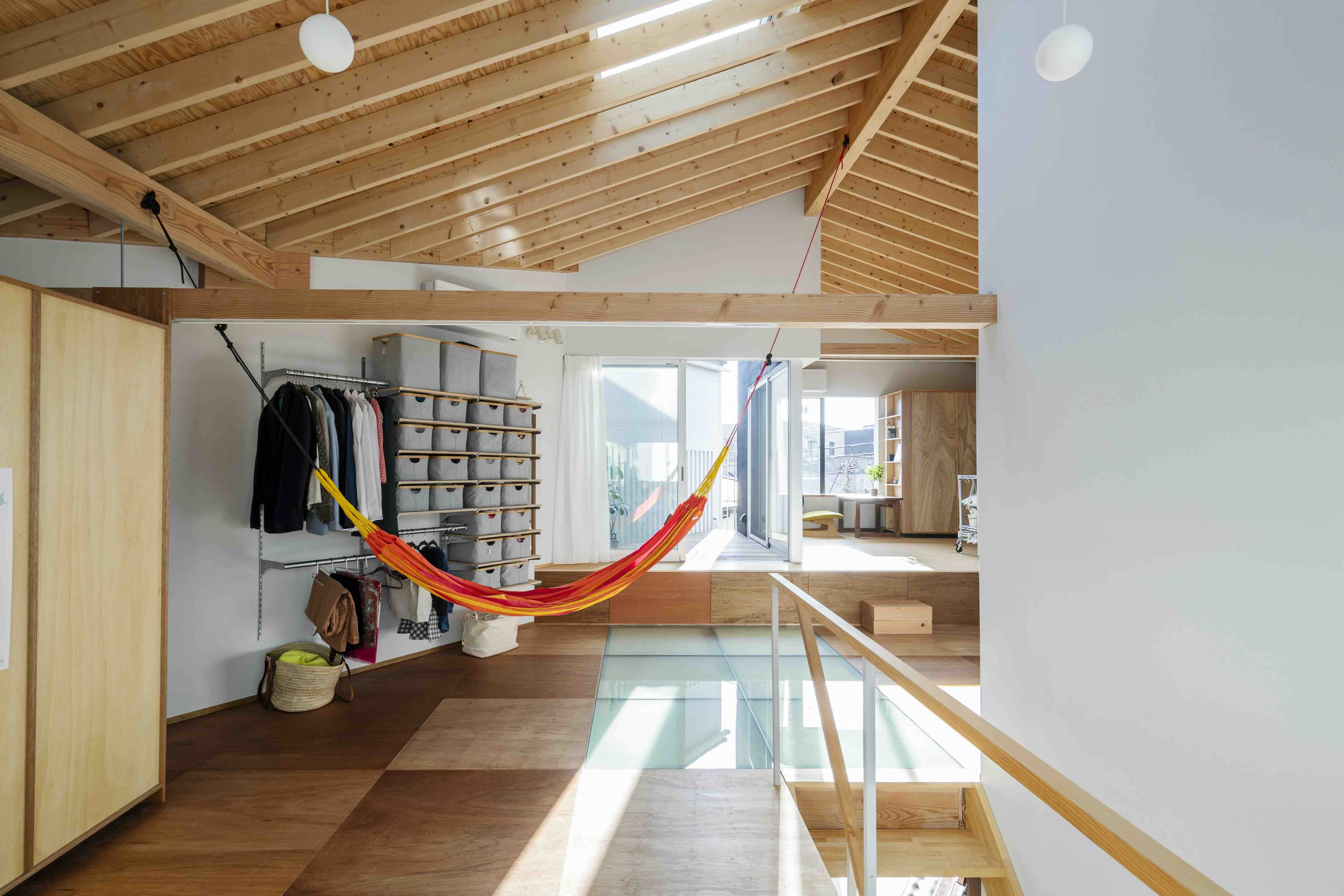 2階は仕切りをほとんど設けない大きなワンルーム。キッチンと食卓を中心に据え、家族が自然に顔を合わせる構成です。3階は天井高を3.5mに確保し、将来的に分割できるよう設計されています。