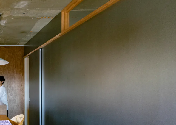 一方、窓際の反対側の壁にはシルバー塗装の仕上げを採用。