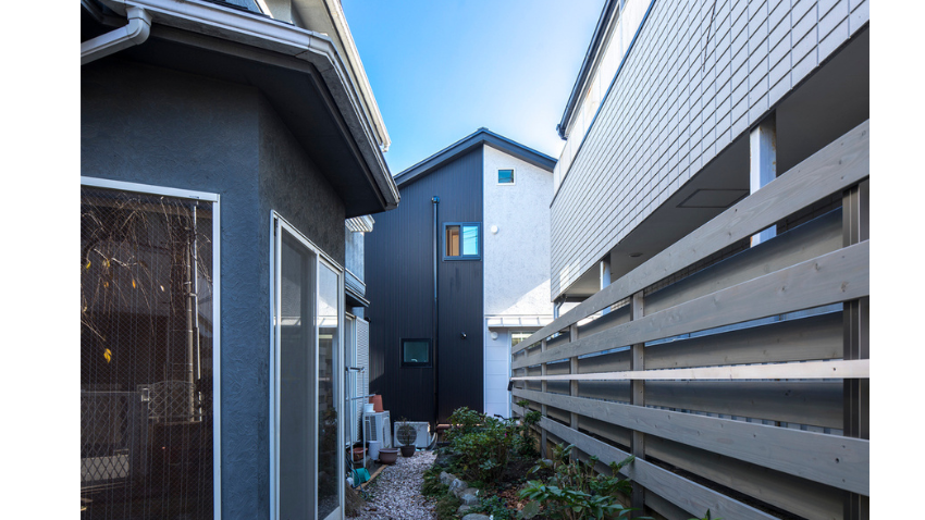 外観は白と黒を半分ずつに分け、その間にはグレーの杉板の塀を設けています。