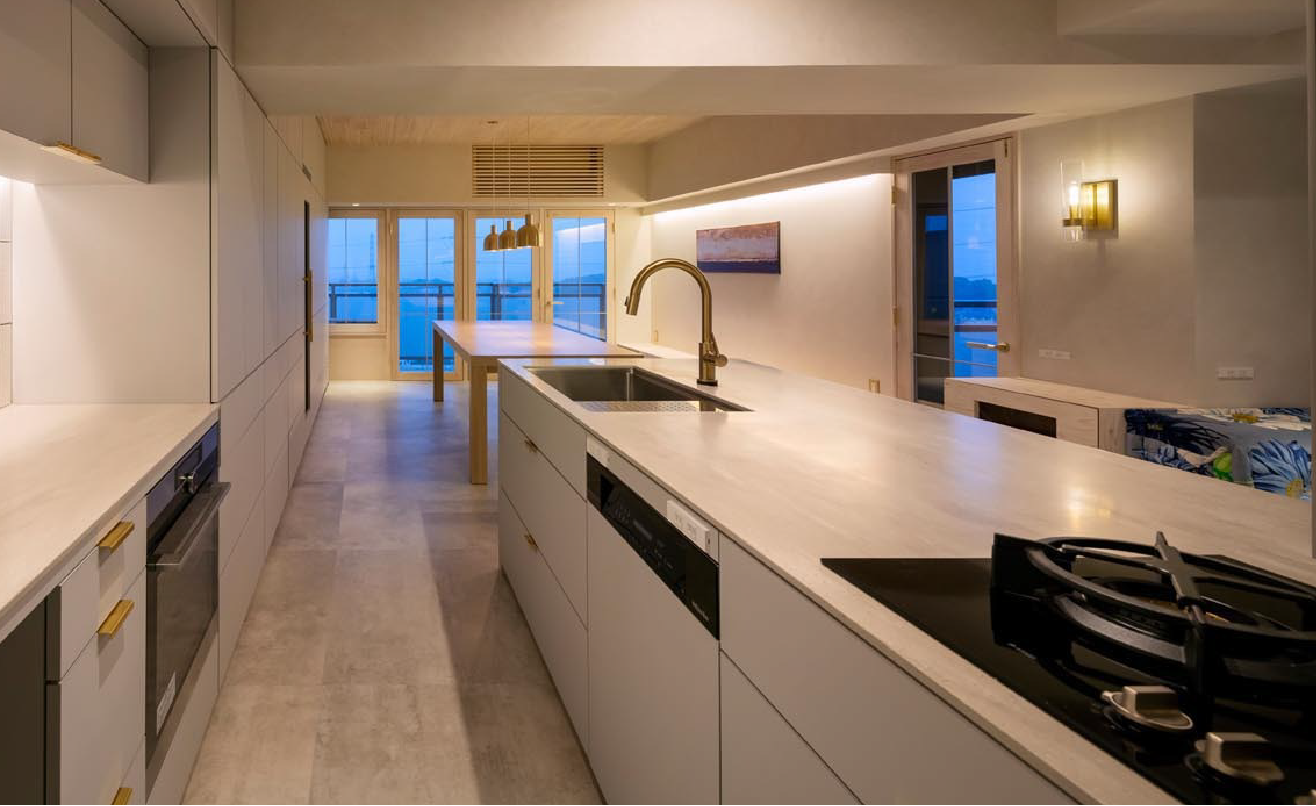 多くの部屋と長い廊下をもつ間取りを暮らしのリズムを感じられる構成へと見直し。SRC構造の大梁が生む高低差をあえて活かし、生活のシーンを数珠つなぎに連続させる“大回廊”として再構成しています。