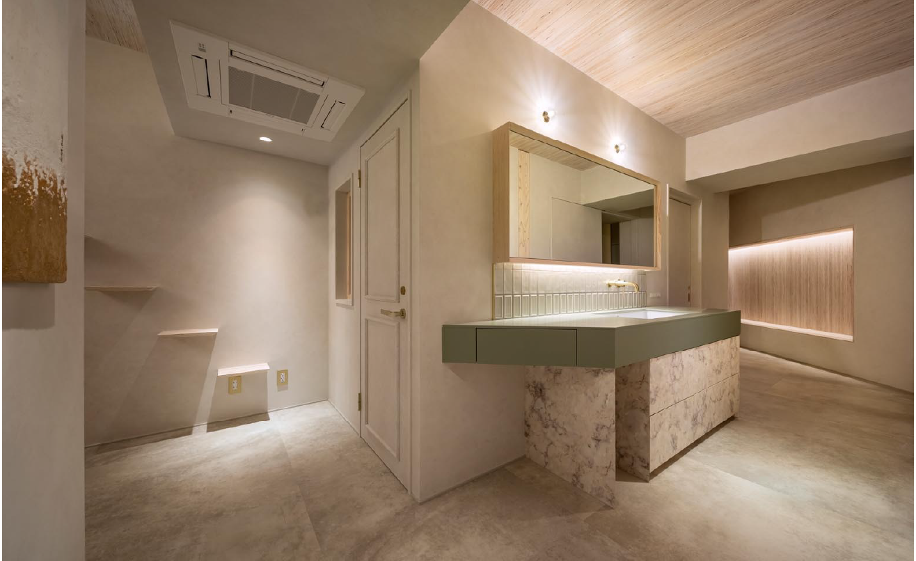洗面はあえて廊下に面して配置し、照明とインテリアを兼ねたオープンな設えに。脱衣室を奥に引き込みながら見せる・隠すのバランスを計画しました。