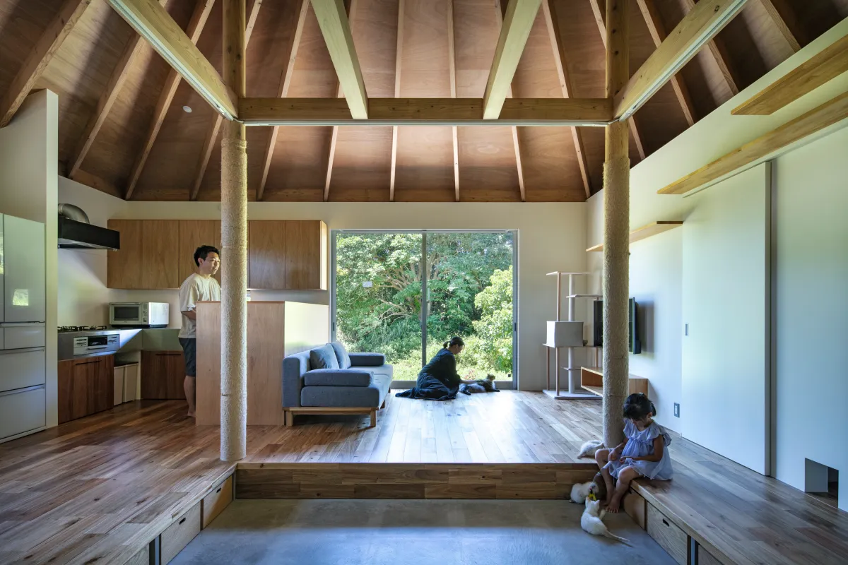 中央の柱は屋根を支える構造体でありながら、猫にとっての動線や遊び場としても活躍します。麻縄を巻いた柱を猫がよじ登り、梁の上を自由に歩き回る姿は日常の光景です。