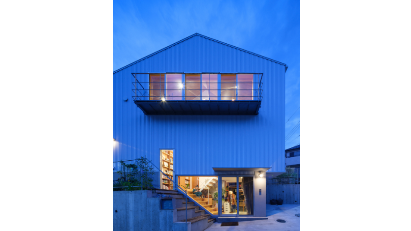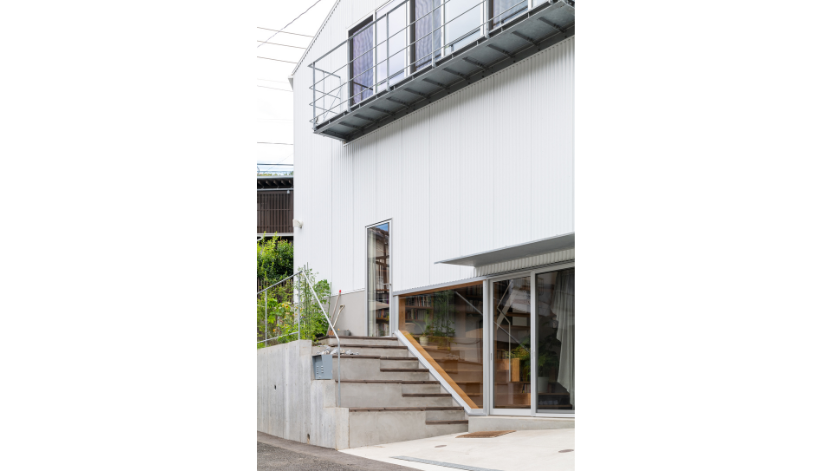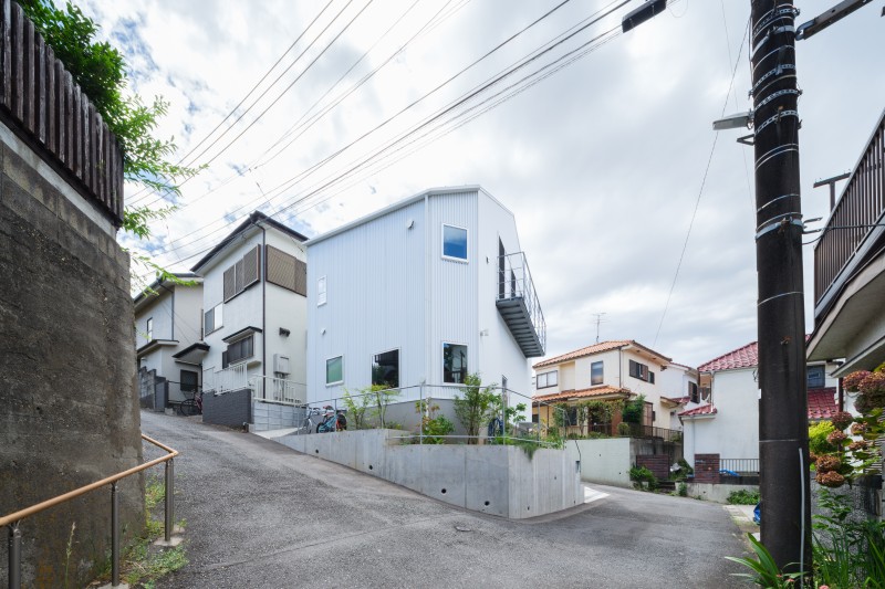 擁壁の上にただ家を乗せるのではなく、 道路から階段が住宅へとつながる構成で、導かれるようなデザインに。今までは擁壁で囲まれた見通しの悪い道も、この住まいが建ったことで明るくなり、街に対しても雰囲気を良くする存在になっています。