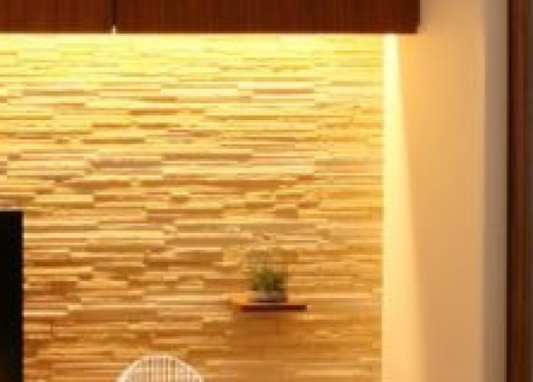 テレビカウンター背面には凹凸のあるタイルを採用。上から下へ光が落ちるように間接照明を設けることで、陰影を際立たせ、空間に奥行きをつくります。
