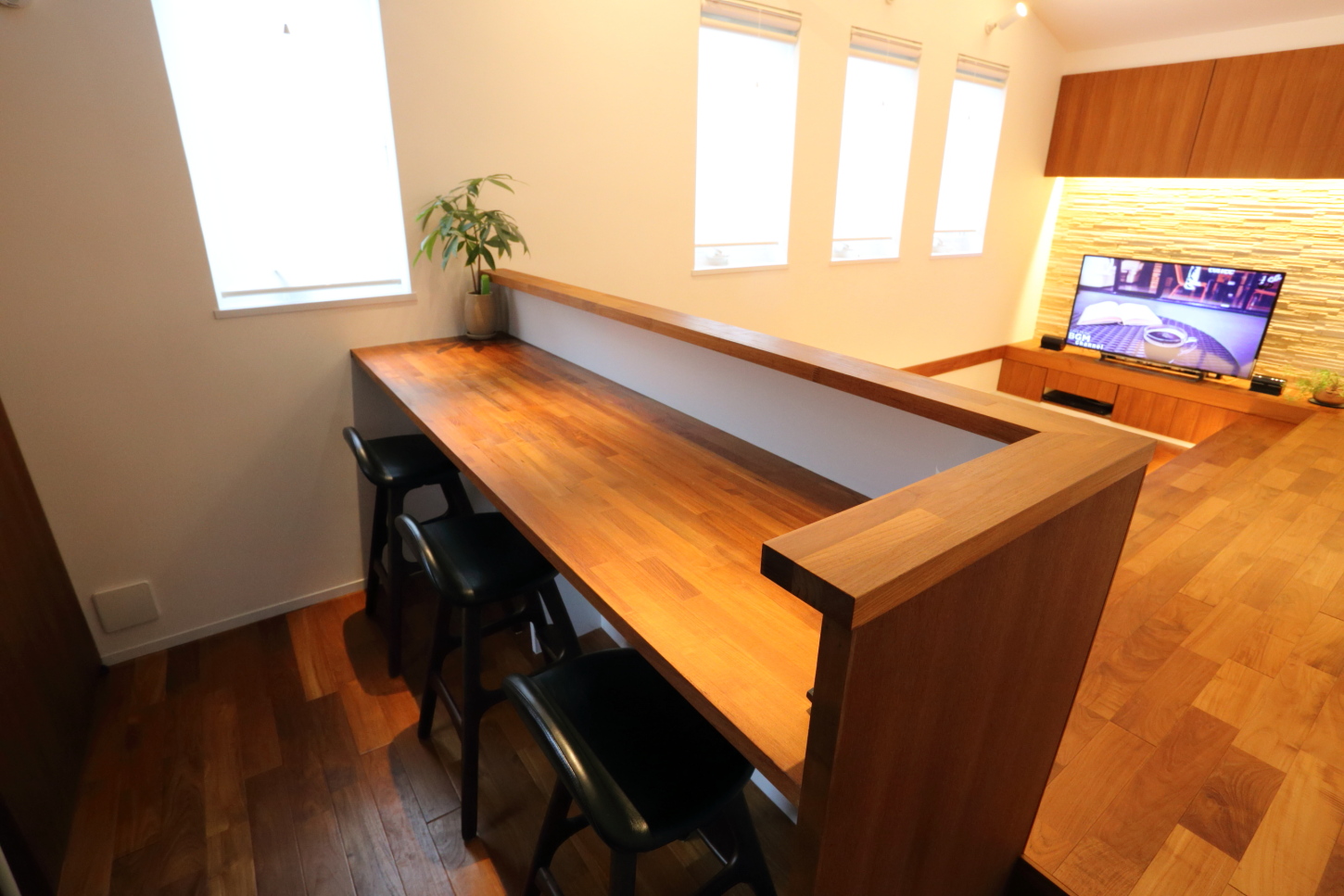 例えば、LDKに大きな家具を置くと、リビングやダイニングは狭くなってしまうため、ソファや大きなダイニングテーブルは置かない選択をし、代わりにリビングでは床を二段掘り下げた「サンクンリビング」を採用しました。沈み込むような形のリビングは、来客の際も座る場所が確保でき、コンパクトながら居心地の良い空間となっています。ダイニングでは省スペースを意識して、備え付けの三人用カウンターを設置しました。