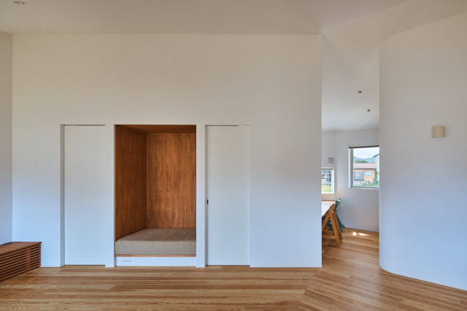 お施主様が幼い頃から慣れ親しんできた敷地。ご希望の収納スペースの確保とスムーズな動線計画を満たしながら、この場所ならではの景色をどのように住まいに取り入れるかを軸に考えた結果、「くの字」のような形状の住まいとなりました。