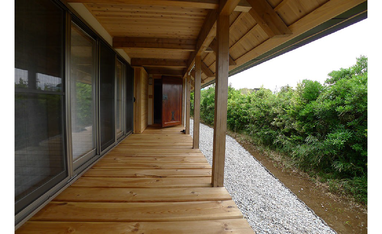 間取りは茅葺き民家の田の字型を現代的に解釈し、大黒柱を中心とした大架構を成立。南側にはお寺の縁側を思わせる外廊下を設け、深い軒で直射日光を遮りつつ、床板の反射光を室内へ。