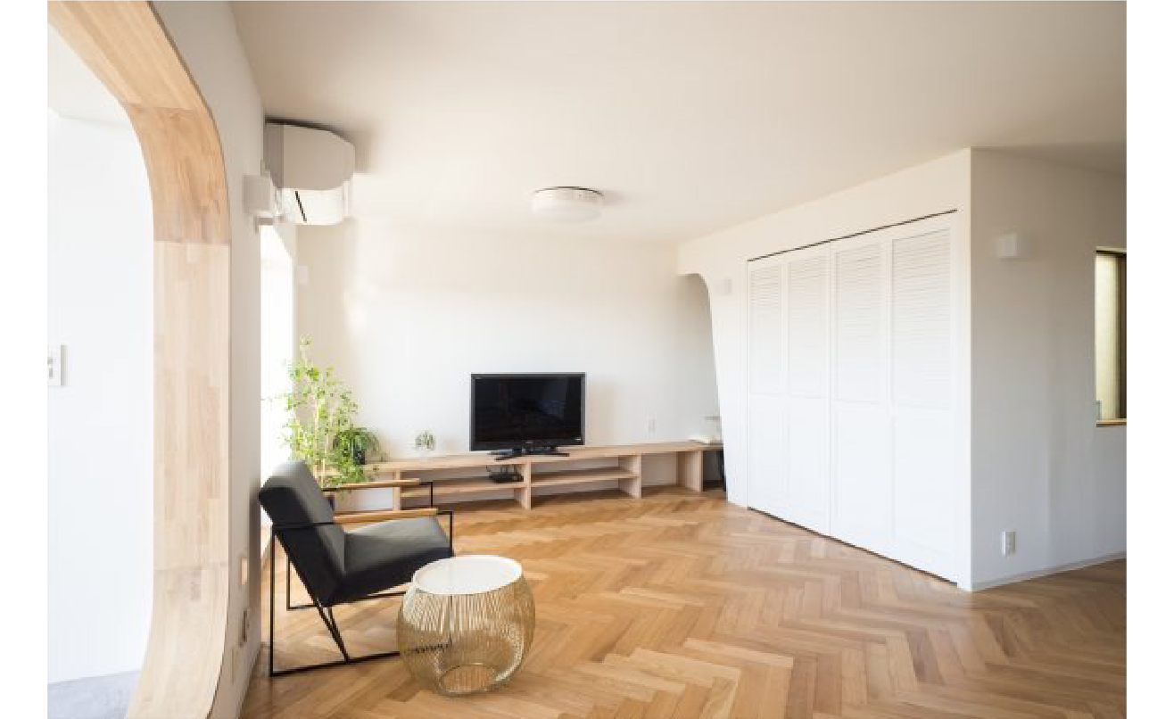 リビングは既存のサッシ部分をアール型の額縁として再構成し、景色を一枚の風景画のように切り取る窓へと転換。