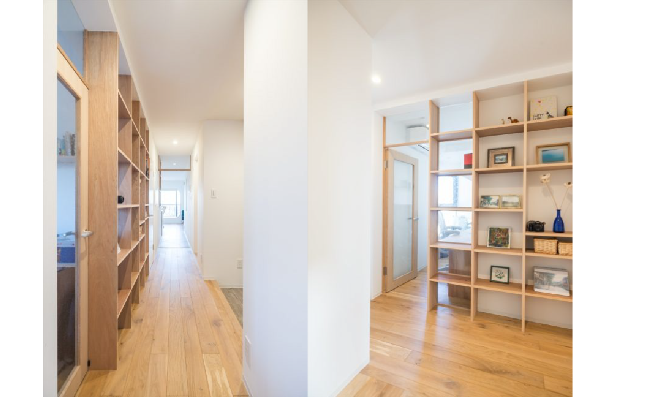 ガラス棚の延長上にご主人のデスクを設け、光を遮らない方向性で構成することで、集中しやすくも閉じすぎないワークスペースとなっています。