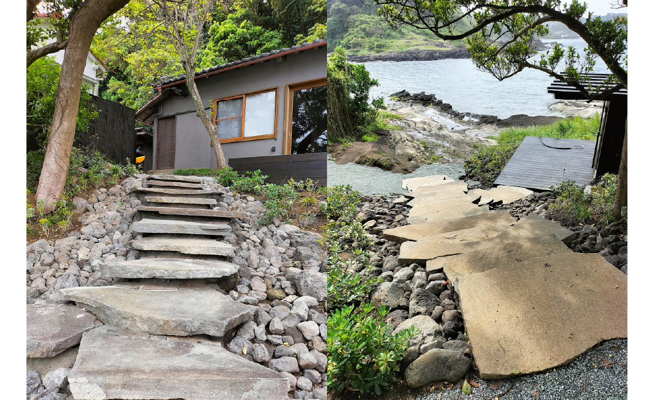 敷地は駐車場から海辺まで高低差15m。蹴上30cmの険しい地形をそのまま生かし、総重量30tの自然石を昔ながらの手動で行う「三又(サンマタ)」、「チルホール(牽引装置)」などの工具を利用してテコの原理で10cmずつゆっくり降ろし階段や飛び石を構築しています。
