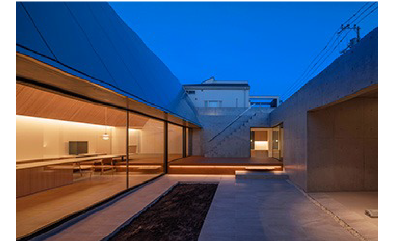 外部は黒い壁と、斜めに差し込む一枚のアルポリック屋根が端正な輪郭を描くように設計。空を映しながら天候によって色を変え、中庭側から見ても重さがなく、光と風を受け止める軽やかな気配が漂います。
