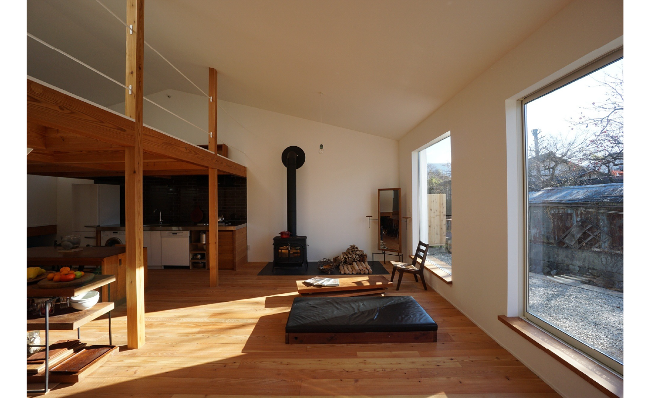 1階床を土台より下げ、棟部分の通し柱においても土台上端から梁下端までを4メートル以内に抑えることで、一般的に流通する無垢材1本で架構を成立させています。平屋のような建て方をベースとしながら、コストと構造の合理性を両立した構成です。